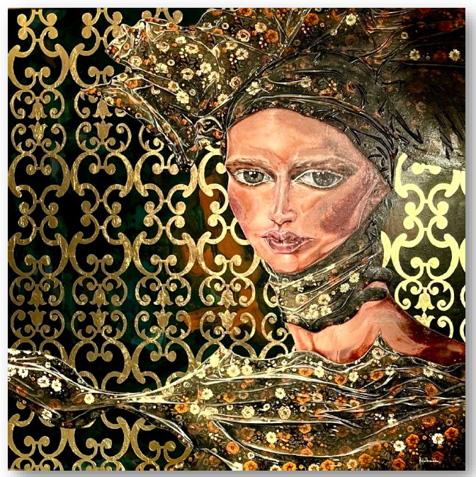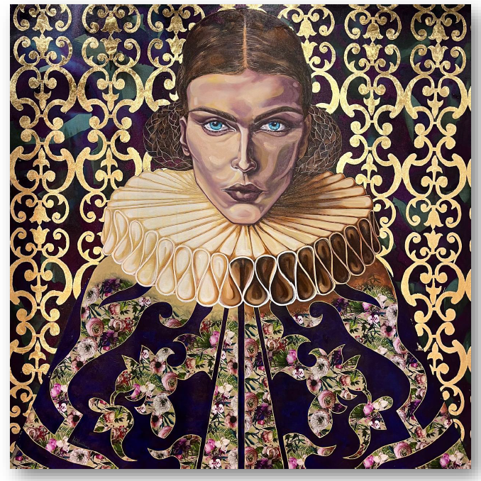 Técnica: Mista (acrílico sobre tela, colagem de tecido e aplicação de folha ouro)